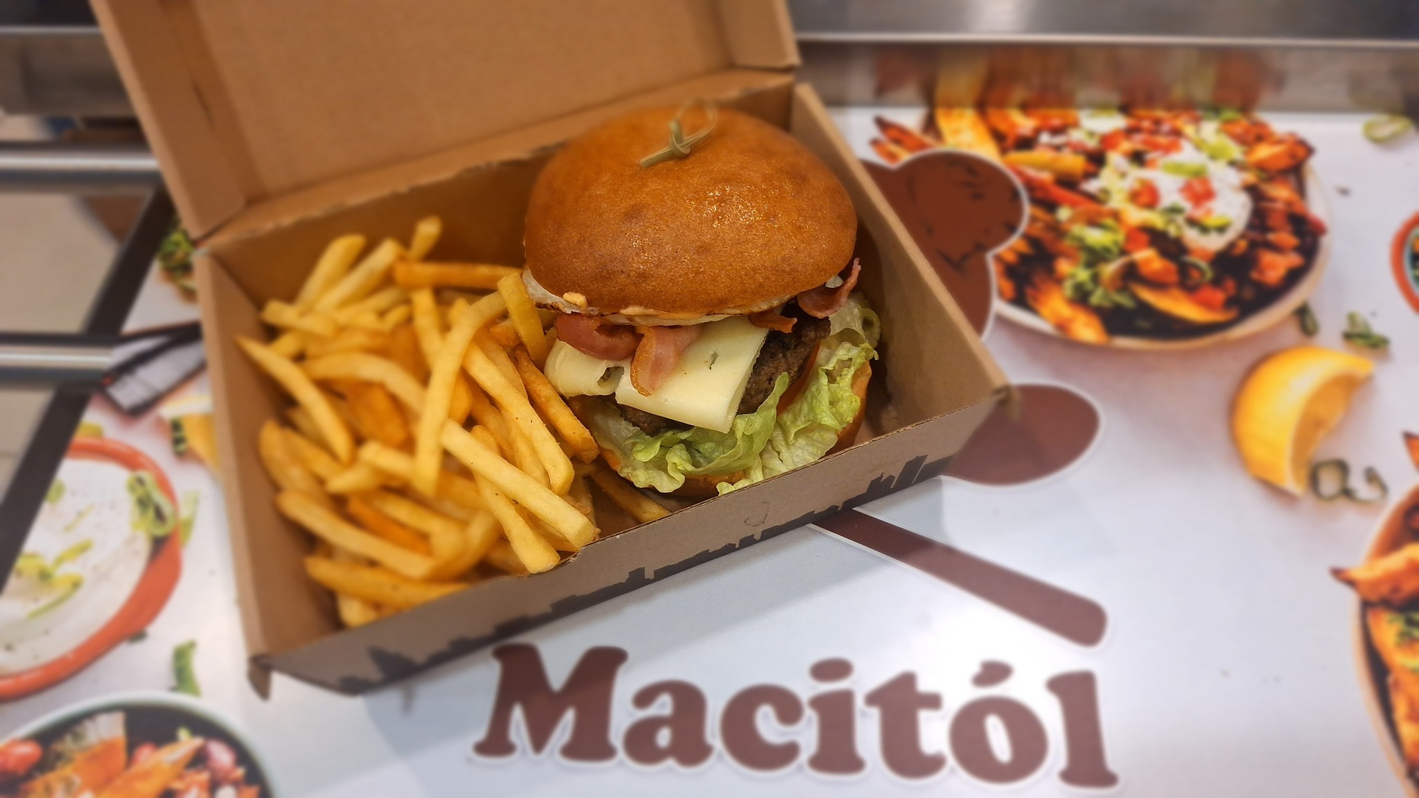 zöldségek, bacon, sajt, tükörtojás, házi hamburgerszósz, hasábburgonya